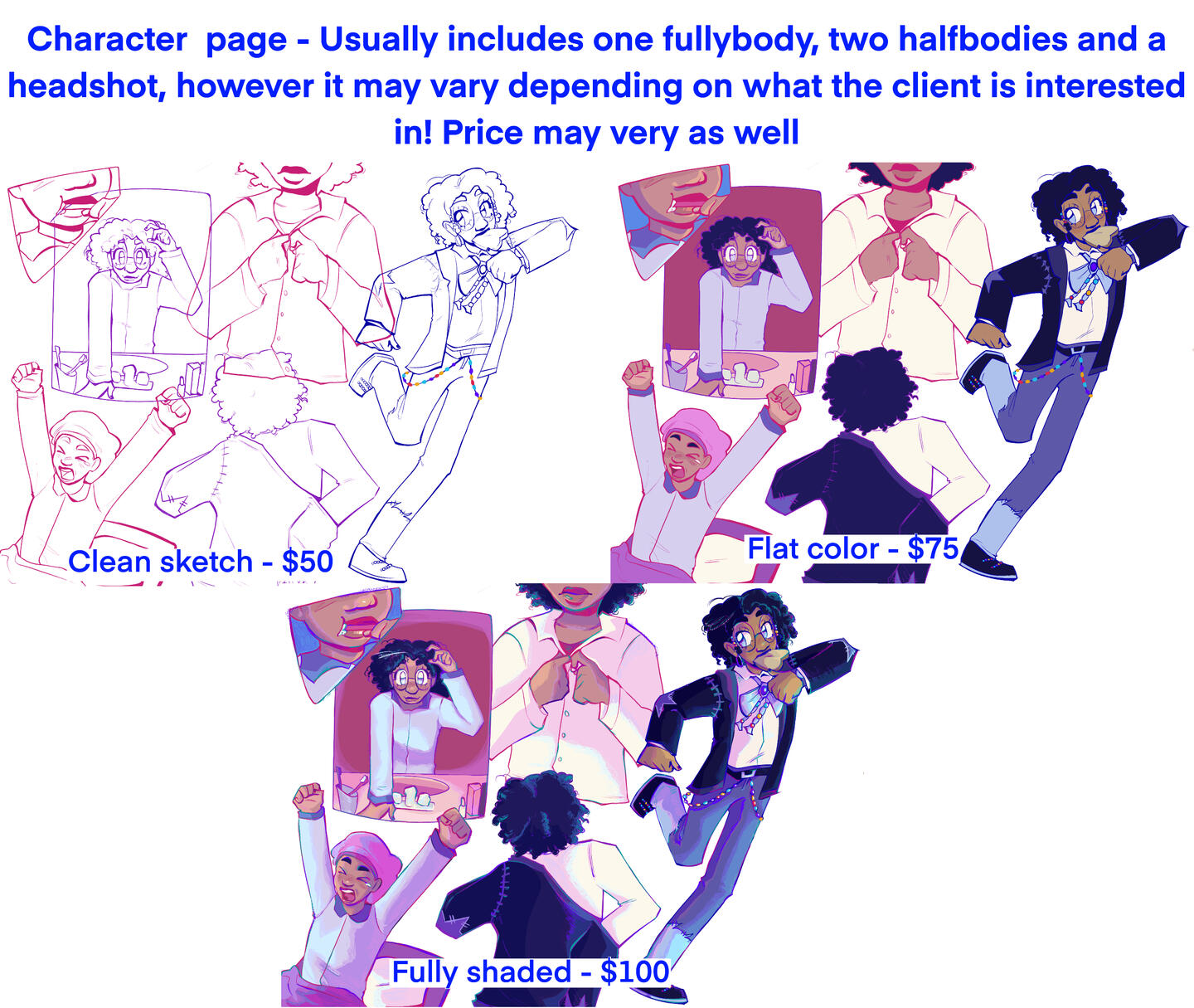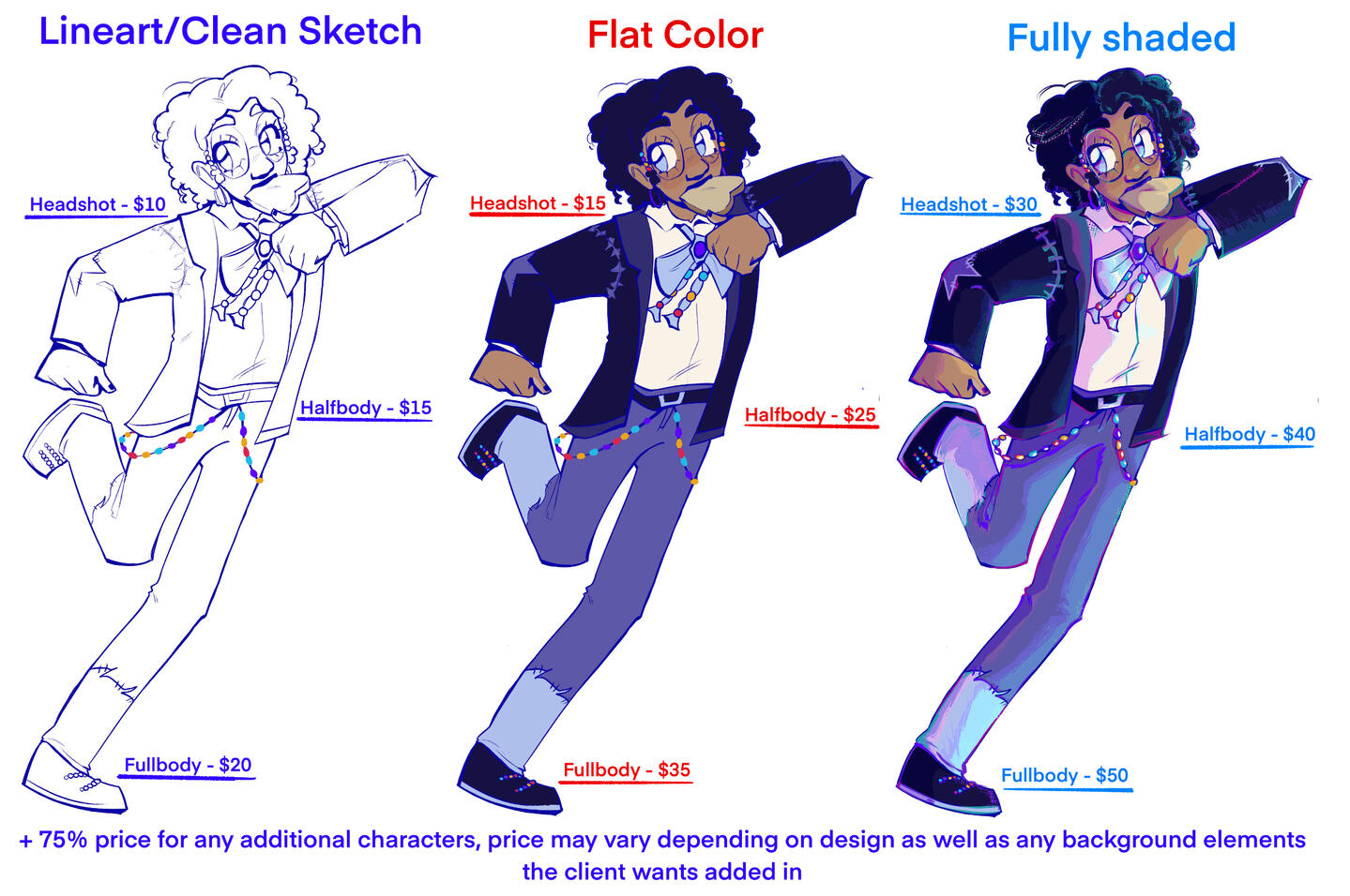 + 75% price for any additional characters, prices may vary depending on the complexity of the design as well as any background elements added